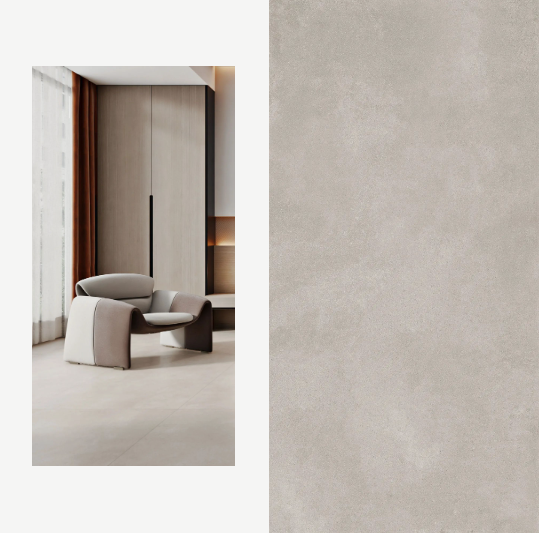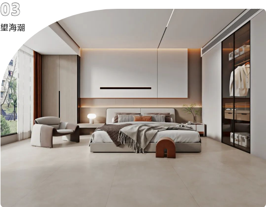 地面選用750x1500mm黃金規格的浪淘沙進行通鋪,簡潔的線條設計與不同材質交匯融合。不僅讓空間更具擴張力和延展力,清新淡雅的綠植作為點綴,猶如置身大自然,仿佛呼吸中亦有抵達心底的治愈。