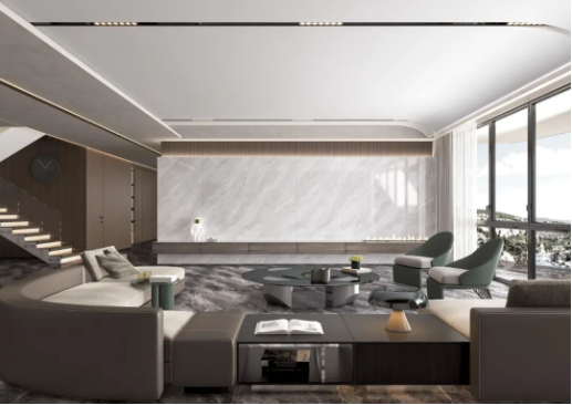 空間結合簡約時尚的家具搭配,無限連紋的線條柔中帶剛,滲透出真實石材的自然韻律,飄然逸動的紋理綿延,山巒疊嶂,橫看成林側成峰,以海納百川之胸懷盡顯磅礴氣勢。