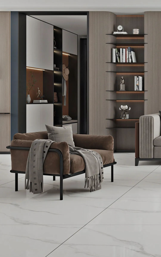 冰河白作為主調的空間,不禁讓人幻想起極其純凈的山河冰川。設計師帶著對自然風光的憧憬,將行云流水般的石紋糅合在瓷磚的表面上,展現出如夢似幻的地貌特色,帶來非凡體驗。